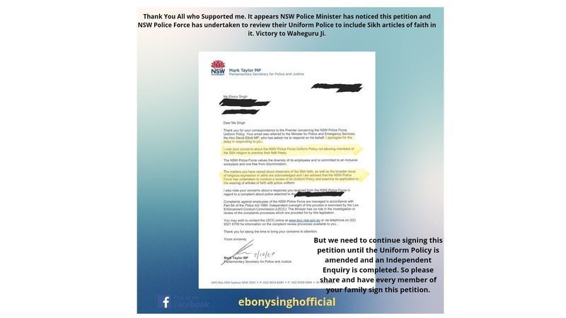 Thank You All who Supported me. It appears NSW Police Minister has noticed this petition and NSW Police Force has undertaken to review their Uniform Police to include Sikh articles of faith in it. Victory to Waheguru Ji.