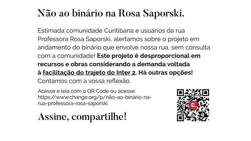 Olá, tivemos mais de 500 visualizações mas ainda poucas assinaturas. O abaixo assinado é importante, os recursos e obras realmente são desproporcionais, existe a real possibilidade de dar folga para o Inter2 por outra rua. A demanda por vagas para carros dos moradores, das clínicas de saúde (citando a real demanda da Clínica Self, para autistas que teve suas solicitações negadas para o embarque e desembarque das crianças, sendo muito sofrida para os pais e as crianças), do parque do Pirata Zulmiro (que hoje conta com brinquedos inclusivos do Projeto LIA) não foram levadas em conta e as vagas serão reduzidas. Se todo o fluxo na extremidade do Lote 5 em questão precisa passar em frente da nova praça de Curitiba que também homenageia a capital catalã, Barcelona, onde, em 2023, Curitiba foi eleita a "Cidade Mais Inteligente do Mundo", a ex futura praça da Araucária terá também poucas vagas para que o público estacione! E a rua Professora Rosa Saposki com volume de tráfego além da demanda para ajudar o Inter 2 seguir mais rápido. Acesse, compartilhe. Somos todos cidadãos!