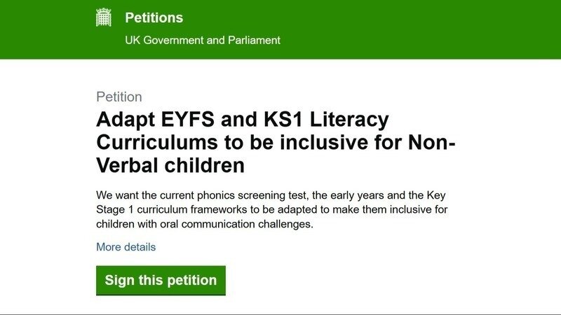 This petition seeks to change this. Sign it here: Adapt EYFS and KS1 Literacy Curriculums to be inclusive for Non-Verbal children - Petitions