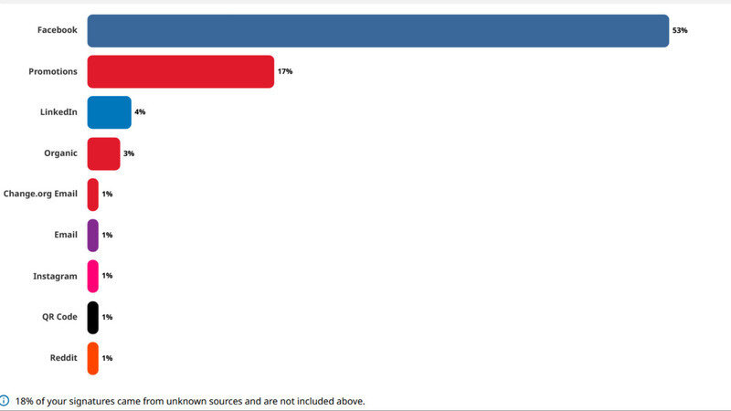 Updated look into where signatures come from for the petition. Overall Facebook continues to be the largest percentage at 53%, but there is increasing diversification. Those who have contributed promotions (thank you!)are the second largest proportion at 17%.