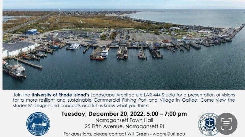 Most recently, the University of Rhode Island conducted updated research on a Resiliency Study for Galilee. Its content will be discussed at a meeting that will be held on December 20th, 2022. The photo that accompanies this posting shows the announcement of the presentation date for the research study that was recently completed by Researcher in Environmental Studies, Dr. Will Green, and Professional Landscape Architect, Charles Carberry, and University of Rhode Island students. The University of Rhode Island completed a prior research study, but as many felt it was dated, a recent research study was completed.