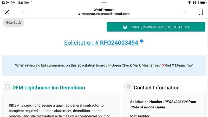 I am glad to hear of the Solicitation RFQ24003494 DEM Lighthouse Inn Demolition. As Attorney Landry noted in his legal brief PRIX needs to pay all legal fees and costs of demolition.