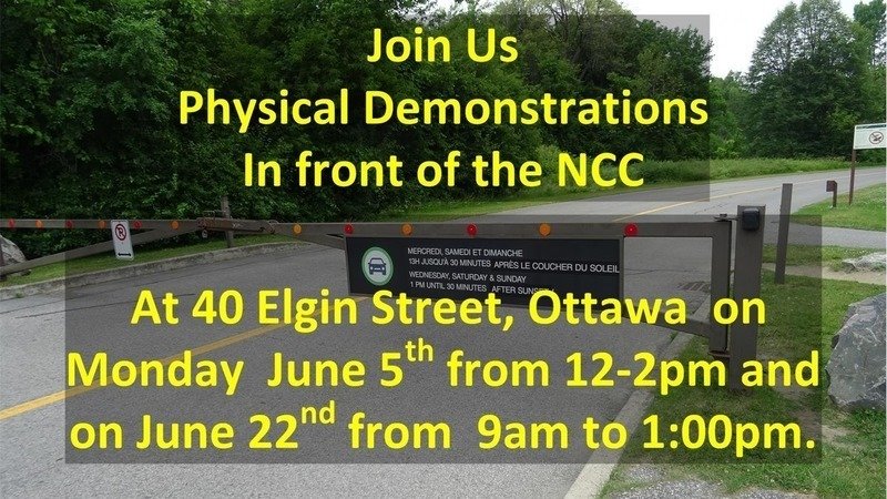 We are holding physical demonstrations in front of the NCC at 40 Elgin Street, Ottawa on Monday June 5th from 12-2pm and on June 22nd from 9am to 1:00pm. June 22nd is the next NCC Public Board of Directors meeting form 10am-12pm. We need a strong presence on that date to show the NCC, its board members and the new board of directors president our cause.