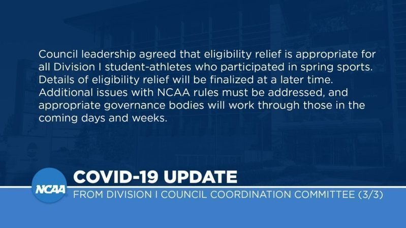 "Council leadership agreed that eligibility relief is appropriate for all Division I student-athletes who participated in spring sports. Details of eligibility relief will be finalized at a later time. Additional issues with NCAA rules must be addressed, and appropriate governance bodies will work through those in the coming days and weeks." -Division I Council Coordination Committee