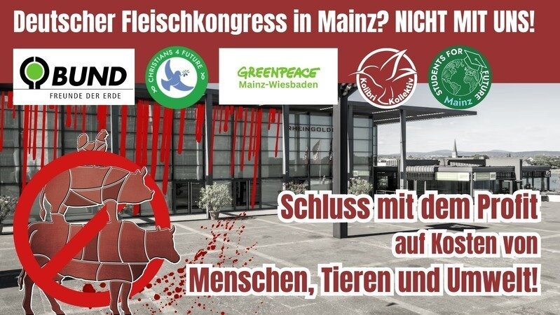 Bereits in den vergangenen Jahren kam es während des Kongresses immer wieder zu Demonstrationen und Störungen [3]. Ein Bündnis lokaler Umweltgruppen, darunter BUND, Greenpeace, das Kolibri-Kollektiv sowie die Students for Future fordert nun ein Ende des Deutschen Fleischkongresses in Mainz. Mit einer Petition [4] fordern sie die Stadt Mainz auf, dem Weiter-so in der Fleischindustrie eine finale Absage zu erteilen und dem Fleischkongress fortan keine Örtlichkeiten mehr zur Verfügung zu stellen.