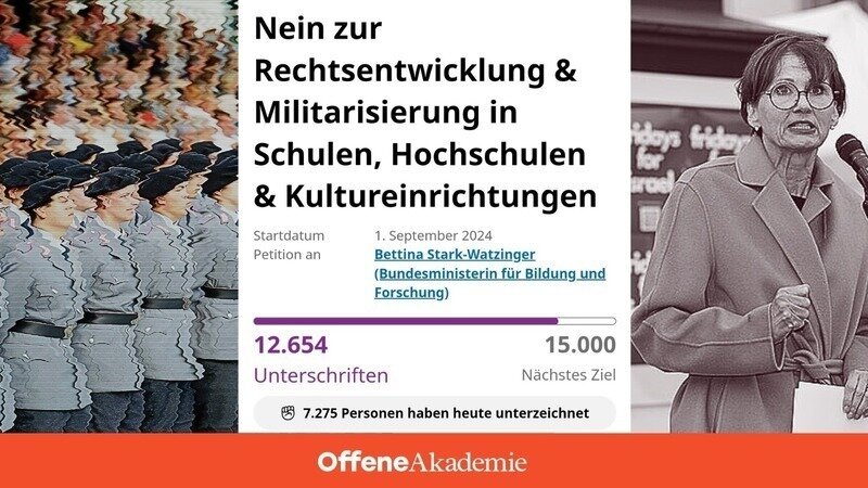 Wir haben einen wichtigen Meilenstein erreicht – über 12.000 Unterschriften für unsere Petition gegen die Rechtsentwicklung und Militarisierung in Schulen, Hochschulen und Kultureinrichtungen. Das zeigt, dass viele Menschen bereit sind, sich gegen die wachsende Kriegsrhetorik und Rechtsentwicklung zu wehren. Doch damit ist unser Engagement noch lange nicht beendet. Wir freuen uns, wenn ihr die Petition teilt, weiterverbreitet und unterstützt, um noch mehr Menschen zu erreichen!