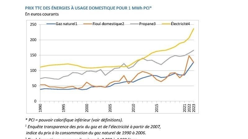 Sur le plan économique, pour le consommateur, ce qui précède a déjà conduit en 10 ans à une augmentation de 85% du prix du MWh et conduira à son doublement en 2040: selon différentes analystes les prévisions représentées sur le diagramme ci dessous, mettent en évidence que la contrainte imposée à EDF de racheter en priorité un KWh éolien cher, est répercutée sur le consommateur ce qui aura pour conséquence que de nombreux ménages seront à court terme dans l'incapacité de payer leur facture d'électricité: une tendance fortement haussière issue de la stratégie