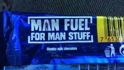 I recently purchased a Yorkie chocolate bar and was extremely shocked to notice 'man fuel for man stuff' printed clearly on the back. In a day and age in which huge steps towards gender equality are being made, I struggle greatly to understand how such a huge brand as Nestlé is still allowed to print such sexist messages on their products. Many impressionable young men and women could be greatly influenced (for the worse!) by these ideologies. I also wonder what they believe 'man stuff', and 'man fuel' to be, and how that is different from 'female stuff' and 'female fuel'.
