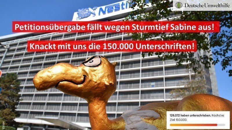 Liebe Unterstützer*innen! Ihr seid der Wahnsinn. Wir haben die 100.000 Unterschriften bei Weitem überschritten. Wir waren heute hochmotiviert eure Stimmen vor Ort an Nestlé zu übergeben. Leider hat uns das Sturmtief Sabine einen Strich durch die Rechnung gemacht. Wir lassen uns davon aber nicht abhalten und sind schon auf der Suche nach einem neuen Termin zur Übergabe eurer Stimmen. Bis dahin bleibt uns auf jeden Fall genügend Zeit die 150.000 Unterschriften zu knacken. Daher mobilisiert nochmal kräftig all eure Freunde und Bekannten. Teilt unsere Petition: www.change.org/nestle-plastikflut