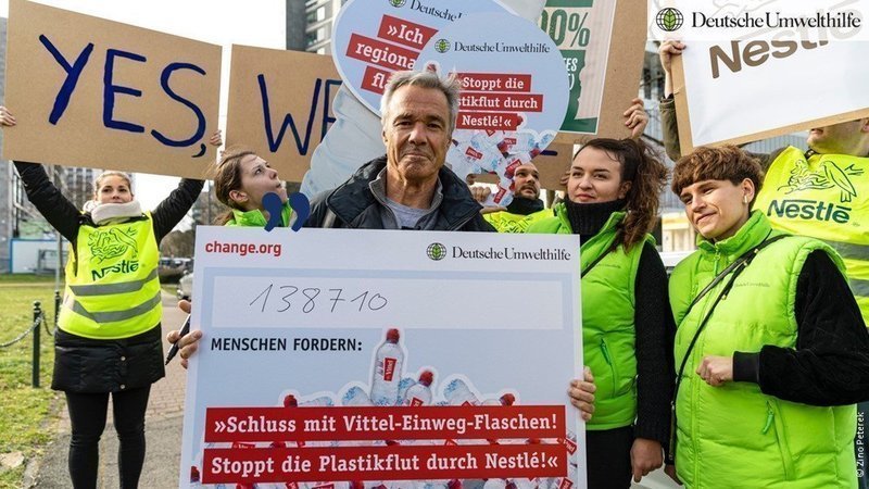 Liebe Unterstützer*innen! Ich war heute mit der Deutschen Umwelthilfe in Frankfurt und habe eure über 138.000 Unterschriften an den Geschäftsführer von Nestlé Waters, Marc Honold, übergeben. Doch Nestlé setzt nach wie vor auf umweltschädliche Einweg-Plastikflaschen! Bitte protestiert unbedingt dagegen und zeigt, dass wir nicht aufgeben.