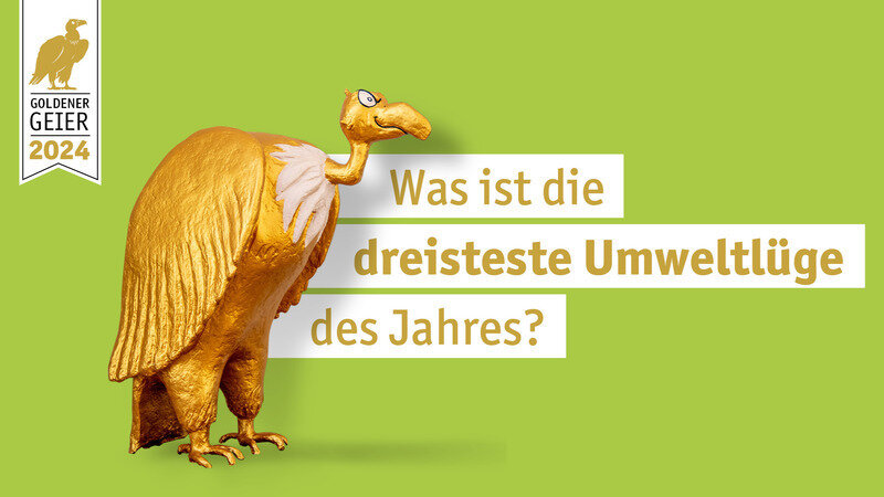 Liebe Unterstützer*innen, wir setzen unsere Suche nach der dreistesten Umweltlüge auch dieses Jahr fort und verleihen unseren Schmähpreis, den „Goldenen Geier“. Dazu benötigen wir eure Mithilfe: Nominiert jetzt ein Unternehmen oder Produkt, bei dem ihr dreistes Greenwashing wittert!
