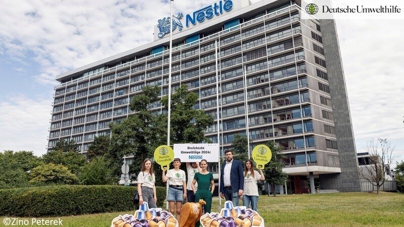 Bereits zum zweiten Mal erhält das Unternehmen den Goldenen Geier. Nestlé versucht sich mit seiner irreführenden Kampagne „#UnterwegsNachBesser“ ein grünes Image zu verleihen und stellt sich fälschlicherweise als Kämpfer gegen Einwegmüll dar. Für diese dreiste Umweltlüge haben wir dem Konzern vergangene Woche in Frankfurt den Schmähpreis „Goldener Geier 2024“ überreicht. Der Grund: Der Konzern hält weiterhin an besonders ressourcenverschwendenden Einweg-Verpackungen fest und ersetzt Plastik durch Papier, ohne dabei die Gesamtmenge an Müll zu reduzieren.