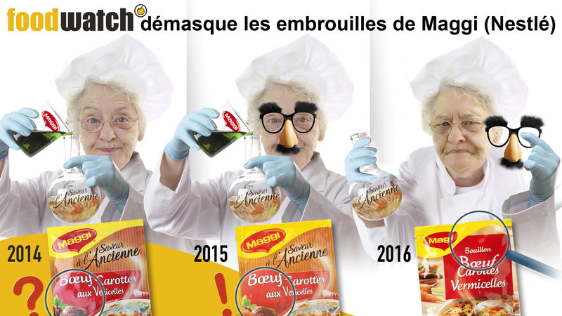 Nestlé avait tenté de nous embrouiller en changeant une première fois son étiquetage en 2015 : une photo du morceau de bœuf retouchée mais toujours pas de viande, à peine 1,1% de… jus de cuisson de bœuf. Et en guise de bonne recette de grand-mère – « Saveur à l’ancienne » - Nestlé nous proposait surtout un produit contenant plus de fécule, d’exhausteurs de goût artificiels, de sucre et de sel que de viande ou légumes.