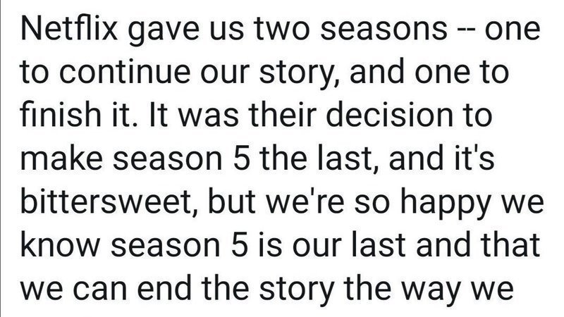 Confirmed by Joe Henderson. Netflix made the call to end show after season 5. They have accepted it as they don't have a choice but we can give them a choice.