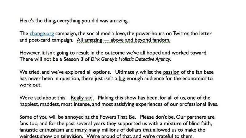 Recently Arvind Ethan David gave his thank you-s to all the fans, and while in his message he stated that they had considered all possibilities, I feel like he did not rule out Dirk Gently coming back in the future, but for that to happen we must keep going.