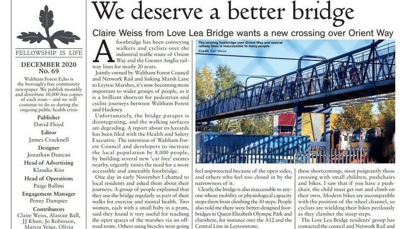 Cabinet Member Clyde Loakes has stated the Council has no plans for replacing or upgrading the Orient Way Footbridge, quoting an old and out-of-date feasibility study for sloping approaches. At the same time the Council's Planning Committee approved the construction of a massive housing estate on the former Lea Bridge Gas Works which will have a new access onto Orient Way a few paces away from the footbridge. The estate will be car-free, which means that thousands of new residents will need to use the footbridge as their most direct and least polluting route for journeys to Hackney or to access the Marshes. The campaign goes on!! See the article on Page 2 of Waltham Forest Echo. Please ask more friends to sign the petition!