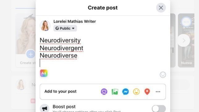 - [ ] FB app on a phone - red lines on Neurodivergent’ and ‘Neurodiverse’ and ‘Neurodiversity’.