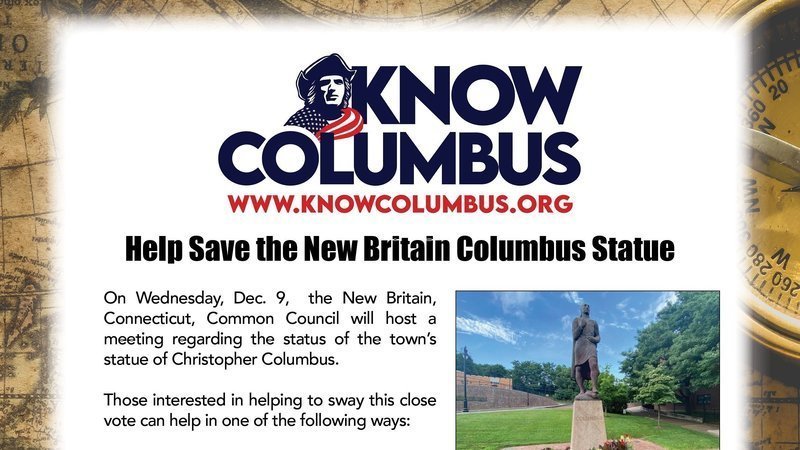 On Wednesday, December 9th at 7:00 PM, the New Britain, CT Common Council will have a FINAL meeting regarding the status of the city's Christopher Columbus statue. It is imperative that you join us in this call-in, especially if you live in the city of New Britain, in order to show support for Columbus.