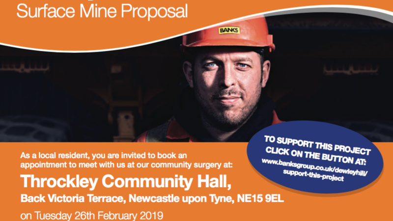 Banks Mining Group is inviting local residents to book an appointment at Throckley Community Hall (NE15 9EL) on Tuesday 26th February 2019 to discuss their plans for mining coal at Dewley Hill.