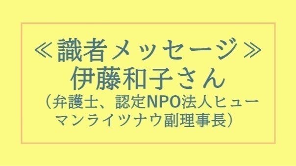 伊藤和子さん(弁護士、認定NPO法人ヒューマンライツナウ副理事長)より、本署名に対する応援メッセージをいただきましたので、皆さまにもぜひご紹介させてください。