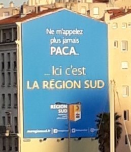 Voici la nouvelle publicité que découvrent, marseillais comme visiteurs, au sortir du tunnel du vieux port. L’affirmation est claire, en majuscules et en gras : « Ici c’est LA RÉGION SUD ». Exit notre PROVENCE… Pourtant aujourd’hui la confusion est maximale : PACA reste présent et est apparu un nouvel affreux acronyme : Région SUD-PACA.