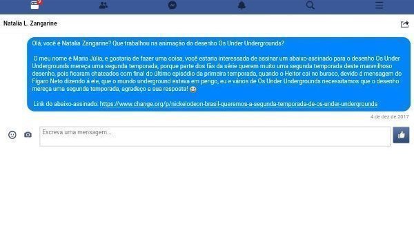Infelizmente, Os Under Undergrounds foi removido da Netflix em 1 de Outubro, logo no início desse mês, mas felizmente o desenho voltou á ser exibido na Nickelodeon, e algum tempo atrás tentei contatar uma das pessoas que trabalhou em Os Under Undergrounds na primeira temporada no Facebook, a Natalia Zangarine (se você não é familiar com esse nome e provavelmente conheça ela pelo seu canal do YouTube, nathy226, é ela mesma) sobre a minha petição para Os Under Undergrounds tenha uma segunda temporada