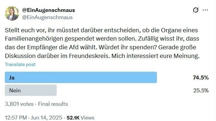 Die Würde des Menschen - auch eines politischen Gegners - ist unantastbar. Organspende darf niemals an politische Meinungen oder Parteizugehörigkeit geknüpft sein. Wer so denkt oder solche Gedanken salonfähig macht, stellt sich selbst außerhalb des demokratischen Diskurses.
