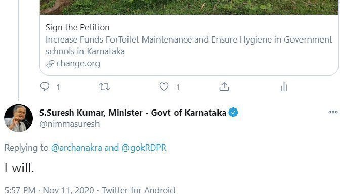 Dear Hon'ble Minister Suresh Kumar Sir, thank you so much for responding to my petition request. You have inspired not only me but 350 plus petition supporters, and we look forward to engaging further for necessary steps to be followed. Please let me know how I may contact you for further communication. Thanking you once more for supporting Increase Funds For Toilet Maintenance and Ensure Hygiene in Government schools in Karnataka