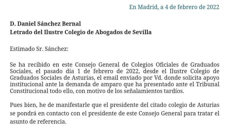 Se ha recibido en este Consejo General de Colegios Oficiales de Graduados Sociales, el pasado día 1 de febrero de 2022, desde el Ilustre Colegio de Graduados Sociales de Asturias, el email enviado por Vd. donde solicita apoyo institucional ante la demanda de amparo que ha presentado ante el Tribunal Constitucional todo ello, con motivo de los señalamientos tardíos.