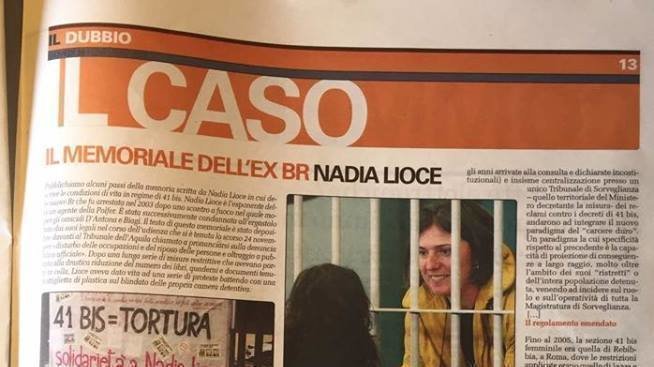 Pubblichiamo alcuni passi della memoria scritta da Nadia Lioce in cui descrive le condizioni di vita in regime di 41bis. Nadia Lioce è l'esponente delle nuove Br che fu arrestata nel 2003 dopo uno scontro a fuoco nel quale morì un agente della Polfer. È stata successivamente condannata all'ergastolo per gli omicidi D'Antona e Biagi.