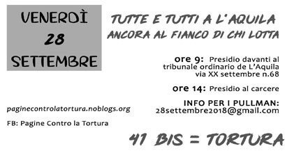 Per questo sosteniamo la mobilitazione del 28 settembre a L’Aquila, e proponiamo una più larga iniziativa al Ministero della Giustizia, contro i provvedimenti governativi su rafforzamento ed estensione del 41bis e di altre misure restrittive della libertà personale, contro l’inasprimento delle condizioni carcerarie, la repressione, la tortura di Stato e la chiara persecuzione, anche pregiudiziale, verso Nadia Lioce.