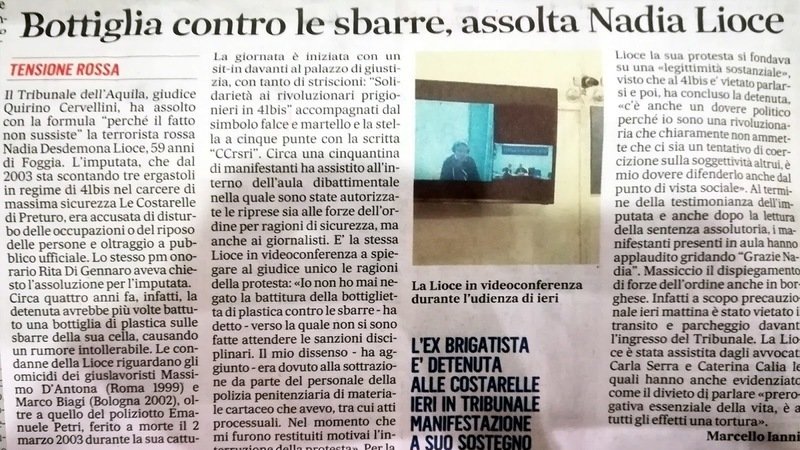 L'assoluzione di Nadia Lioce è perché il fatto non sussiste, ma la tortura di questo regime speciale sussiste eccome. Ed è con questa consapevolezza che dopo il tribunale ci siamo recati sotto il carcere di L'Aquila, con un breve corteo spontaneo.