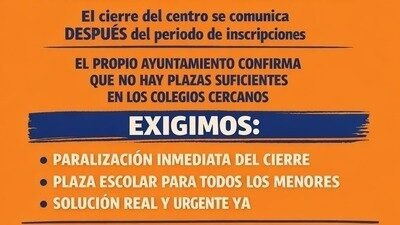 159 niños y niñas en edad de escolarización obligatoria se quedan sin escuela tras una decisión comunicada después del periodo oficial de preinscripción, dejándonos sin margen real para reaccionar.