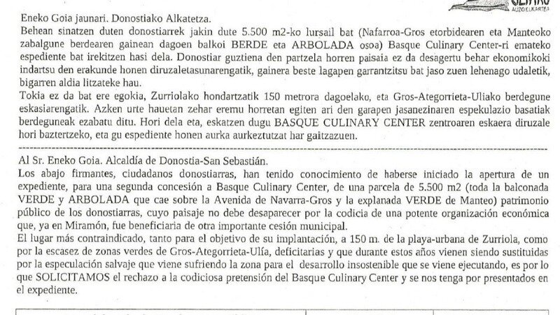 Por una parte, la Asociación de Vecinos de Ulia va a interponer un recurso al Plan Especial de Okendo-Alde y, por otra parte, todavía no se ha firmado la cesión de suelo público entre el Ayuntamiento de Donostia y la Fundación privada del BCC.