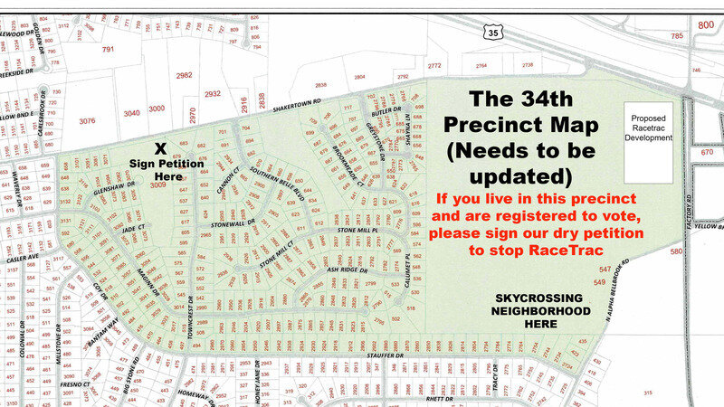 - SIGN DRY PETITION: If you live in the 34th precinct (see map above), we need 250 registered voters to sign both of our dry petitions prohibiting the sale of carry-out alcoholic beverages (one petition for beer and one for wine/liquor). A large portion of a gas station’s convenience store’s profit is carry-out beer, wine, and liquor sales. It is our hope that without these carry-out alcohol sales, RaceTrac may reconsider building here without suing the city: