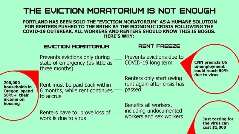 Portland has been sold the "Eviction Moratorium" as a humane solution for renters pushed to the brink by the economic crisis following the COVID-19 outbreak. All workers and renters should know this is bogus.