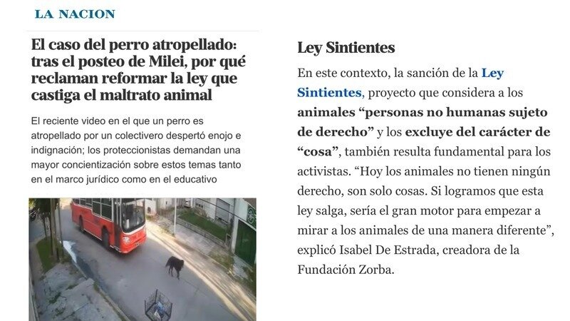 We were interviewed by La Nación, one of the largest papers in Argentina, to expose the URGENT NEED to pass the #SentientLaw project, following the case of Emilia, the dog killed last January 11, after a school bus driver intentionally ran over her.