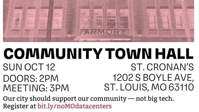Stop the Armory Data Center! Join us this Sunday for a COMMUNITY town hall to learn how St. Louis residents can organize together to win a moratorium on data centers.
