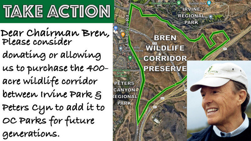 NOW IS THE TIME to ask Chairman Bren of The Irvine Company to consider donating or allowing us to purchase the 400-acre wildlife corridor between Irvine Regional Park and Peters Canyon Regional Park. His support will help preserve this critical habitat for future generations.