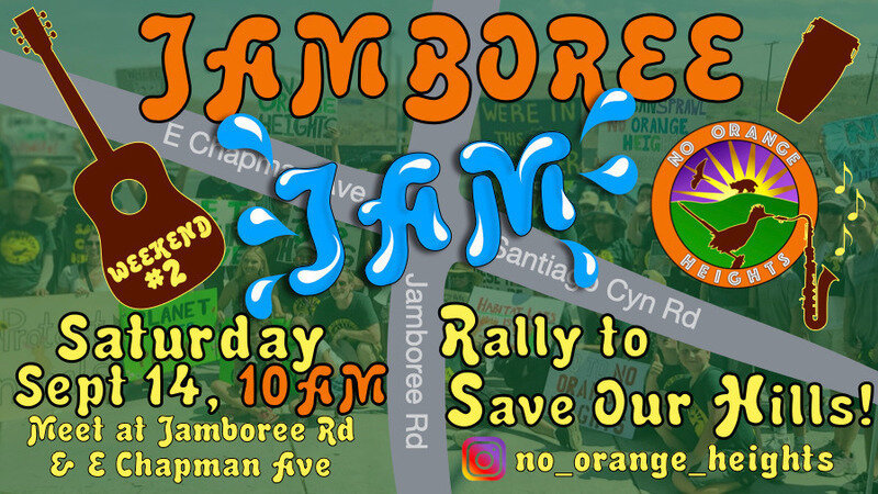 The Jamboree Jam! — A MAJOR peaceful rally to save our hills! Featuring inspirational speakers, a protest march, live music jam and coolers filled with kombucha and ice water.