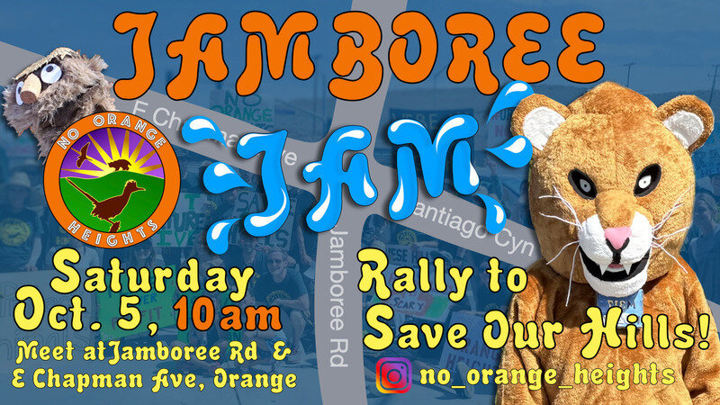 The Jamboree Jam! — A MAJOR peaceful rally to save our hills! Featuring a protest demonstration, march, live music jam and a letter writing activity (templates, postage & envelopes provided).