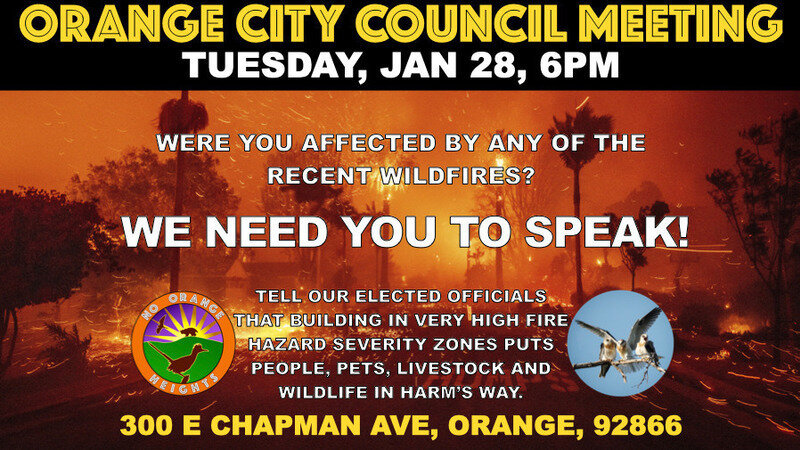 In response to the catastrophic wildfires, please attend Tuesday evening's Orange City Council Meeting to speak about our concerns around the fire danger presented by the Orange Heights development. Building in a Very High Fire Hazard Severity Zone puts people, pets, livestock and wildlife in harm's way.