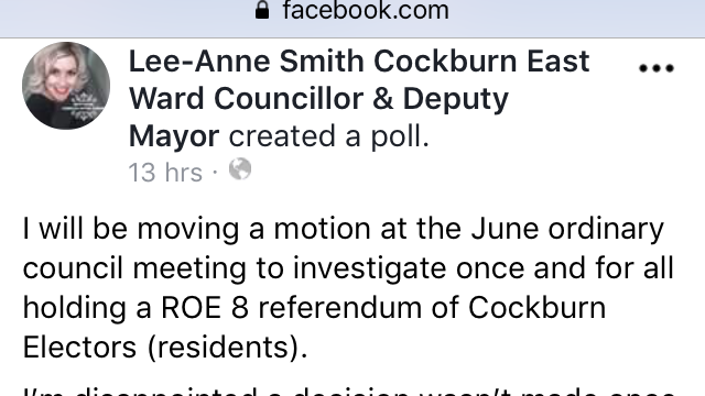 Let’s also not forget Lee Anne Smith was trying to endorse a Labor candidate at the recent Cockburn election and is on record as being anti Roe 8. So why the change? Politics...