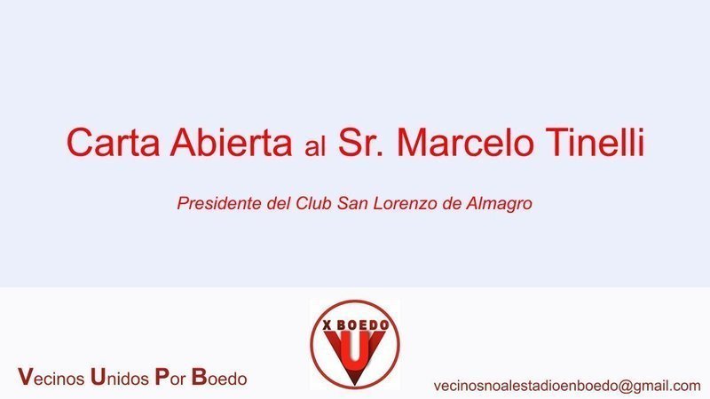Los Vecinos del barrio de Boedo, queremos manifestarle nuestra honda preocupación y angustia por su pretensión y de muchos simpatizantes del Club, de construir en el predio de Av. La Plata al 1700 un estadio de fútbol.