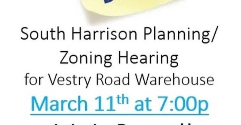 South Harrison Planning and Zoning Hearing pertaining to the Vestry road Warehouse will be held March 11th at 7:00pm at the South Harrison Elementary School located at 904 Mullica Hill road Harrisonvill, NJ.