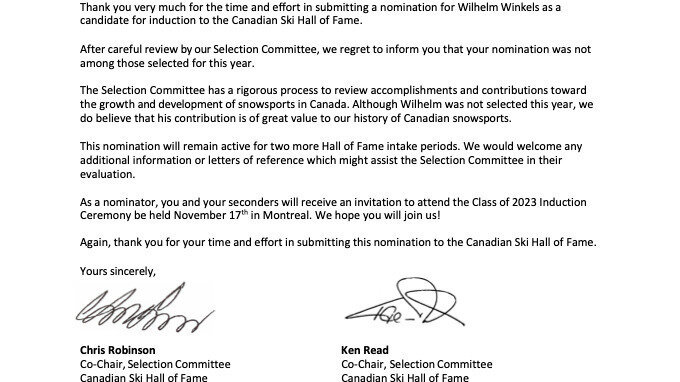 Dear Celine,Please find attached a letter from myself and Ken Read as Co-Chairs of the Canadian Ski Hall of Fame Selection Committee concerning your nomination of Wilhelm Winkels.Should you have any questions please feel free to reach out to us at any time.Kind regards,