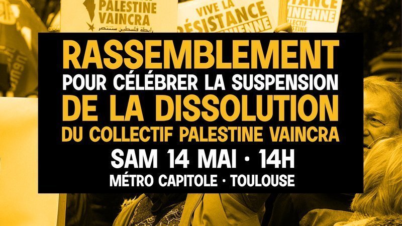 Le Comité contre la dissolution du Collectif Palestine Vaincra appelle à se rassembler samedi 14 mai dès 14H au métro Capitole pour célébrer cette première victoire et réaffirmer notre solidarité avec le peuple palestinien qui continue de faire face à une brutale politique coloniale.