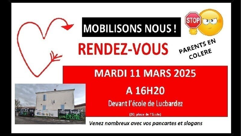 🏫 Parents, enfants, familles, habitants de nos communes rurales, enseignants, personnel périscolaire de nos écoles, venez nombreux nous soutenir mardi 11 mars 2025 à 16h20 devant l'école de Lucbardez.
