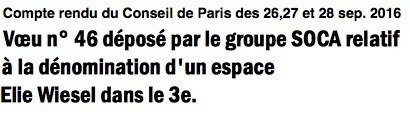 Le contact avec la Mairie de Paris est pris. Pour honorer le nom d'Elie Wiesel relatif au voeu 46, nous proposons comme espace la place de Thorigny situé dans le 3e arr. entre le musée Carnavalet et le musée Picasso. Le nom du square du Temple doit rester inchangé! Continuons la pétition!