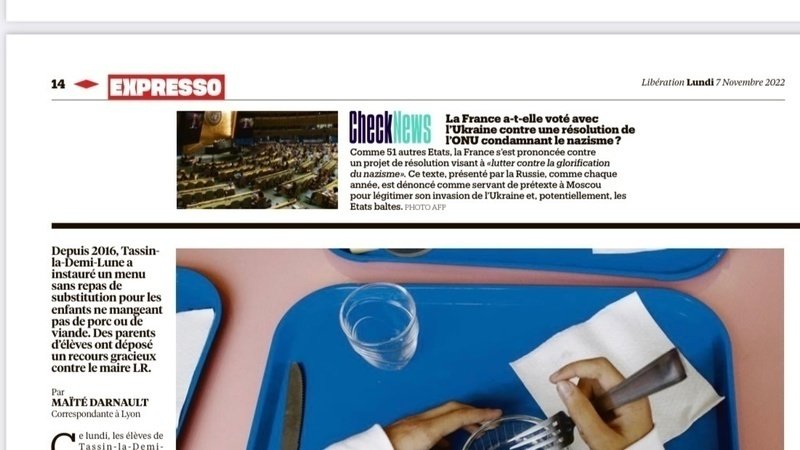 C’est aussi aujourd’hui que le journal Libération publie, en exclusivité, une pleine page sur notre demande d’abrogation du menu unique dans toutes les cantines scolaires de Tassin-la-Demi-Lune (69) ��